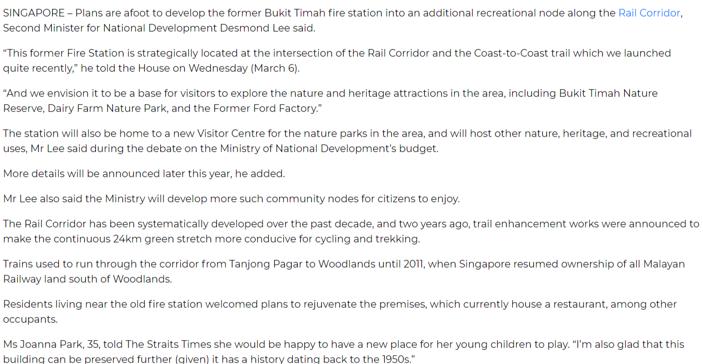 Parliament: Bukit Timah fire station to be turned into visitors' centre, recreational node